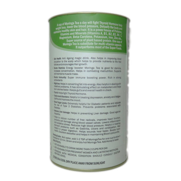 Pour one cup of boiling water on 1-3 spoons of Moringa. Steep it for 5-10 minutes. Strain it and enjoy hot or cold Moringa Tea