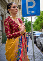 Monjolika Fashion Foil Print Yellow Viscose Silk Classic Saree