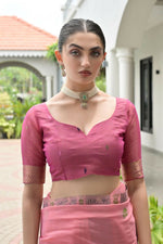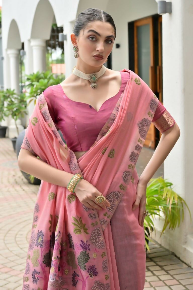 Vishnu Weaves Women's Pink Muga Cotton Thread Weaving Saree with Blouse