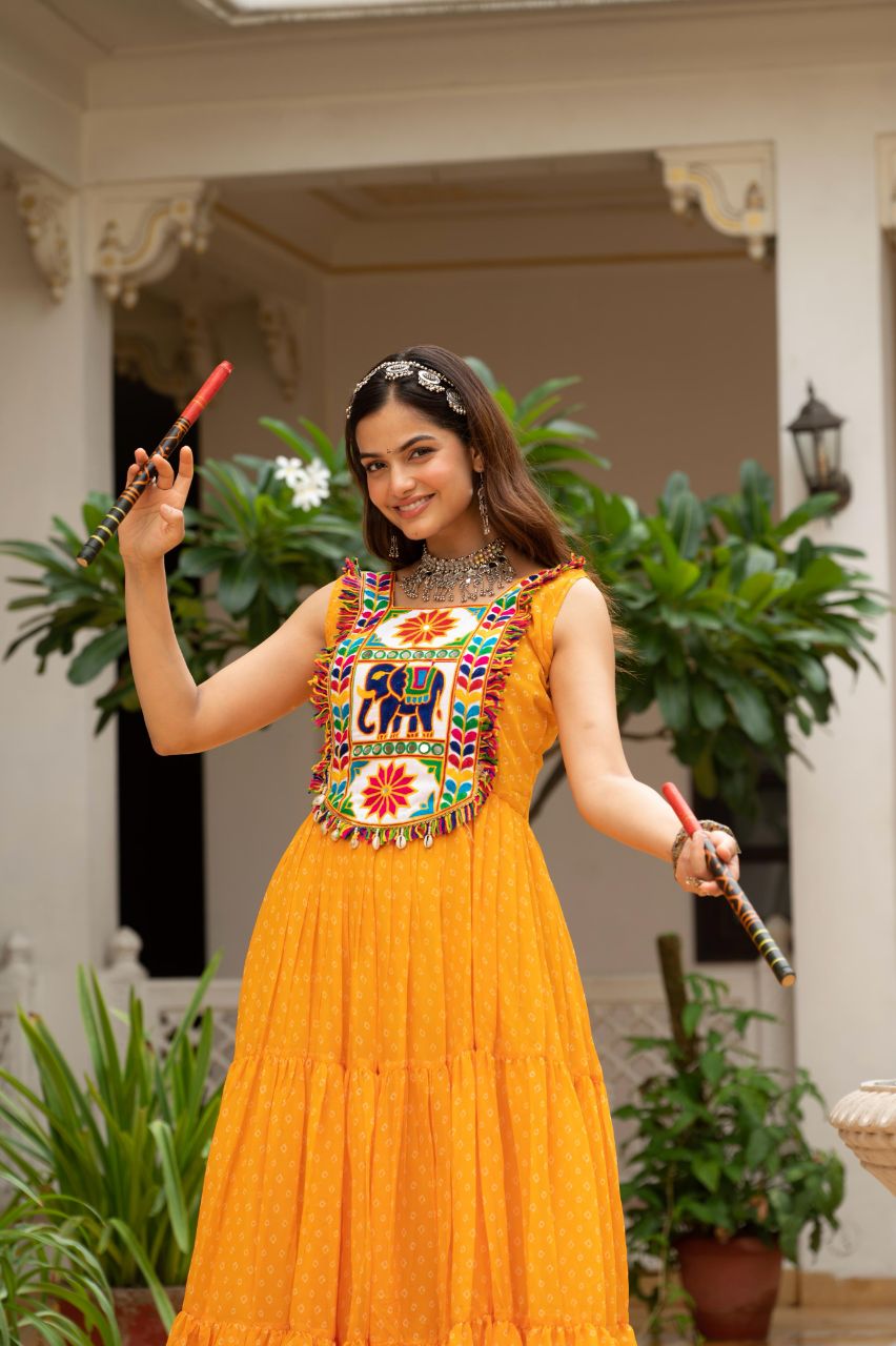 Prazu Fashion Yellow Georgette Bandhani Print Work With Kutchi Patch work Navaratri Gown