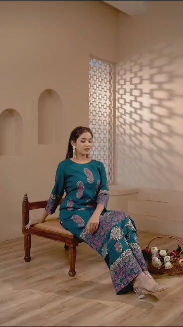 Aniyah Rayon Teal Blue Color Block Print Straight Kurta Palazzo Set (AN-223K)