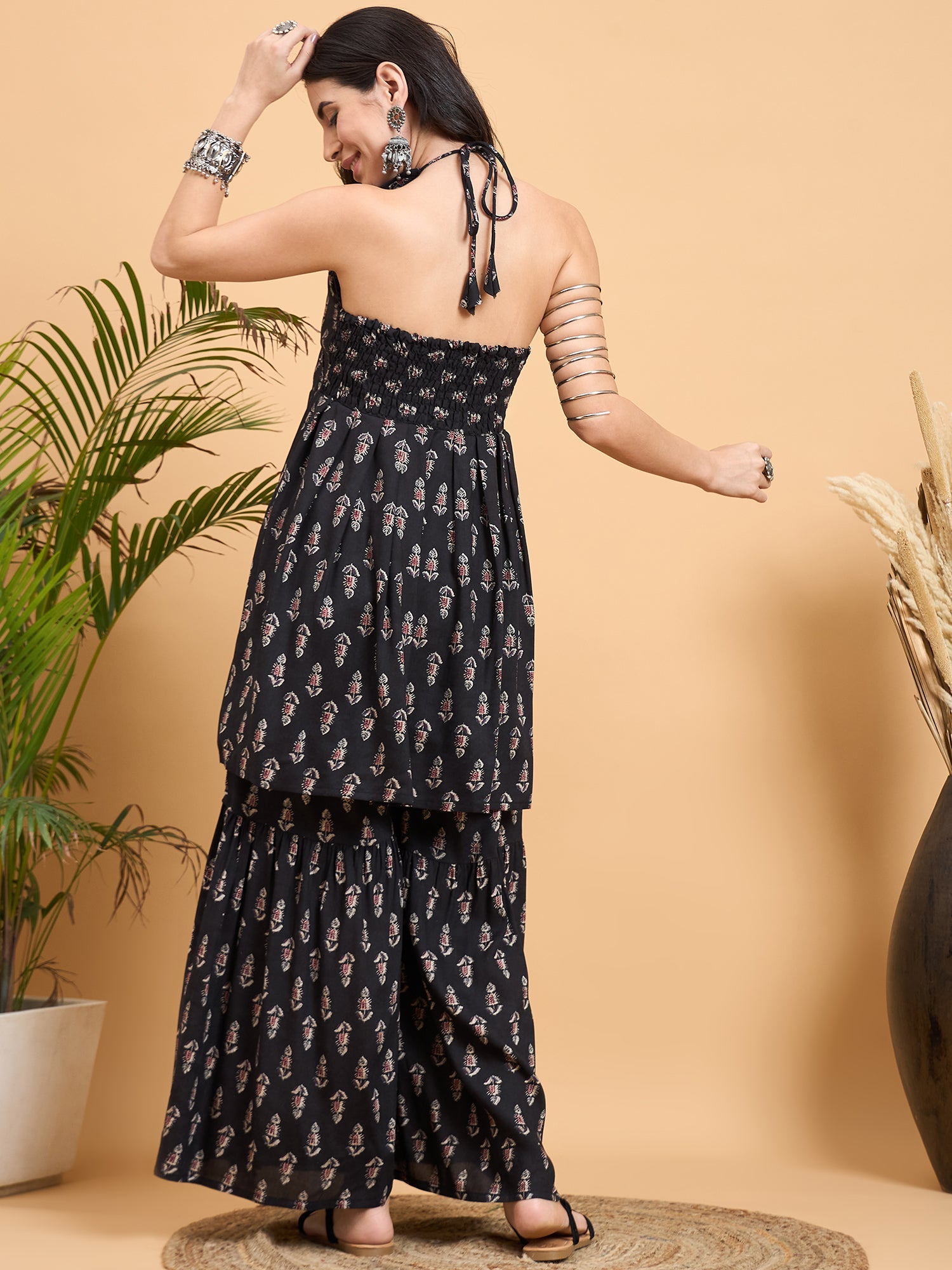 InWeave Black Booti Rapid Print Backless Kurta Sharara Set - Distacart