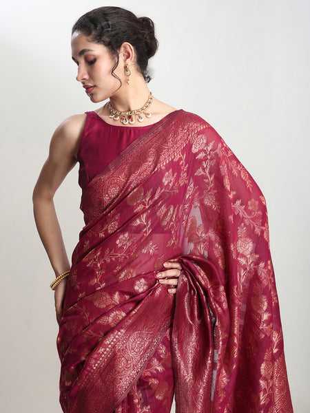 Janasya Magenta Silk Blend Floral Jacquard Saree