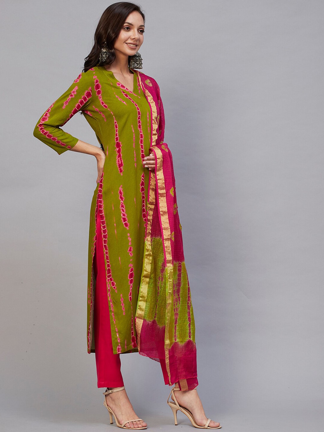 Kalini Printed V Neck Kurta With Trousers & Dupatta Product Details Green & pink printed Kurta with Trousers with dupattaKurta design: ...