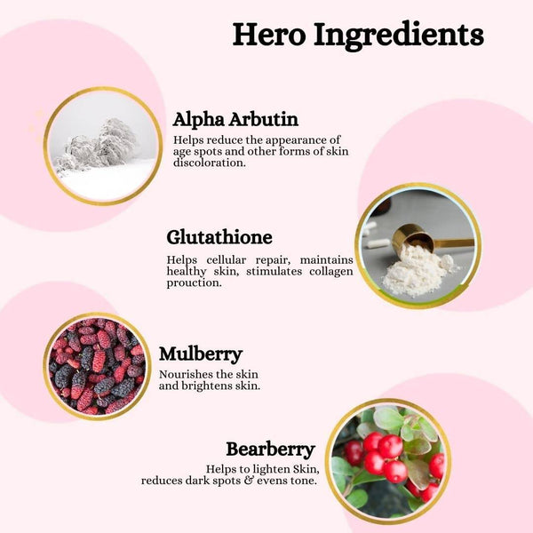• Alpha arbutin evens out the tone of the skin and makes it look nourished and healthy. When this product is used regularly, it helps get rid of sunburn, age spots, and acne. Also, it gives the skin a natural base that helps it look smooth. Our Alpha Arbutin Serum is the ultimate solution for hyperpigmentation and uneven skin tone, formulated with a blend of natural ingredients that work together to reduce the appearance of dark spots and improve skin texture.