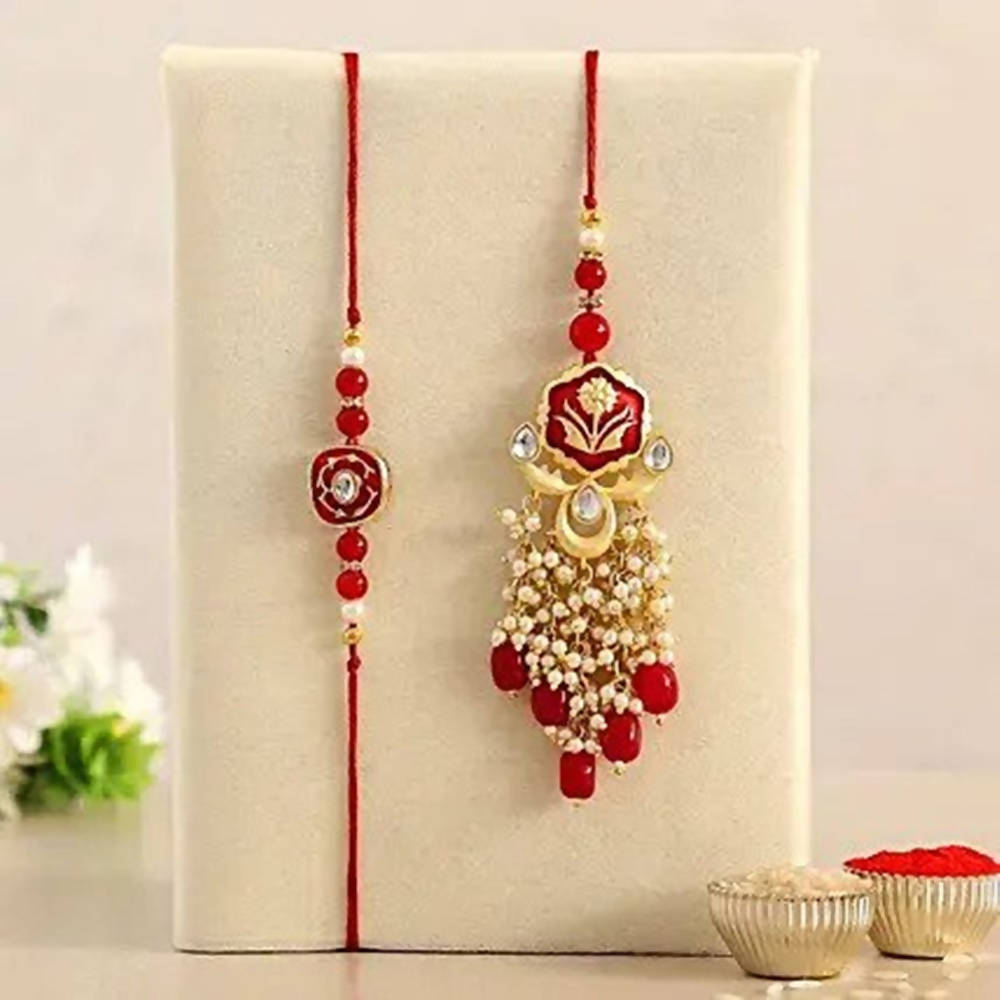 Beautiful Red Bhaiya Bhabhi Kumba Rakhi Set: Combo PackProduct Details: Bhaiya Bhabhi Lumba Rakhi- Set of 2 Delicately designed for an ethnic look ...