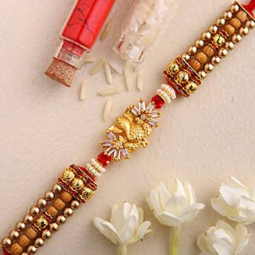Ganesha Design Rakhi and Fruit N Nut Chocolates Combo:Product Details: One Ganesha Rakhi This devotional rakhi highlights Ganesha for a pure look C...