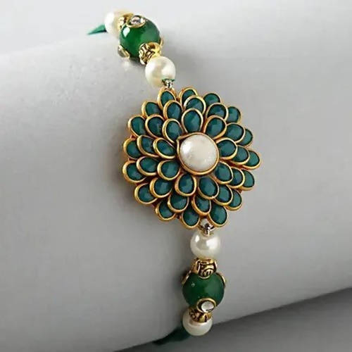 Premium Beads Rakhi & Box of Choco Swiss: ComboProduct Details: One Premium Beads Designer Rakhi This designer rakhi highlights beads for a tra...