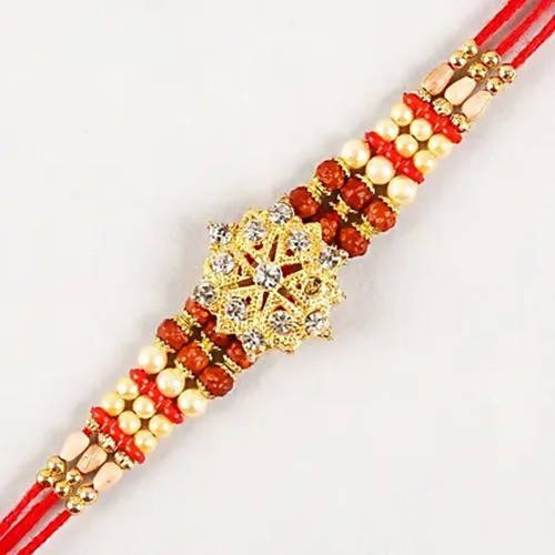 • This designer rakhi showcases rudraksha detailing for an ethnic look