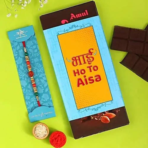 Rudraksha Rakhi & Bhai Ho To Aisa Amul Chocolate Sleeve: Combo Product Details: One Rudraksha Rakhi This rakhi showcases rudraksha for a devot...