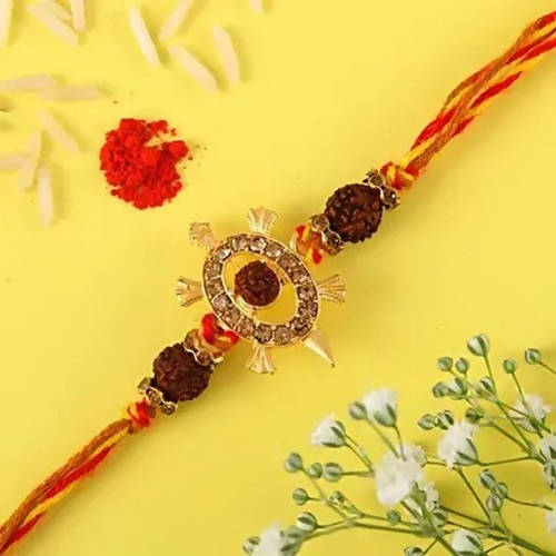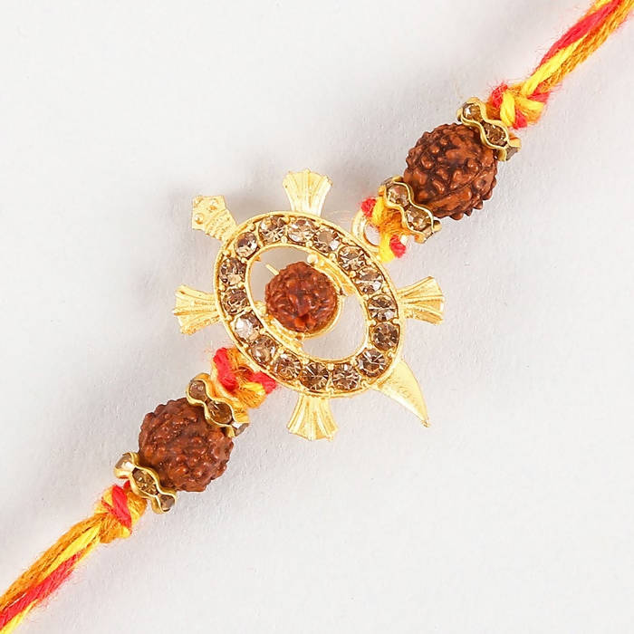 • This designer rakhi showcases rudraksha detailing for an ethnic look