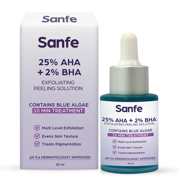 Sanfe 25% AHA + 2% BHA Exfloating Peeling SolutionAbout the product: Multi-Level Exfoliation: Formulated with 25% AHA and 2% BHA, this peel exfolia...