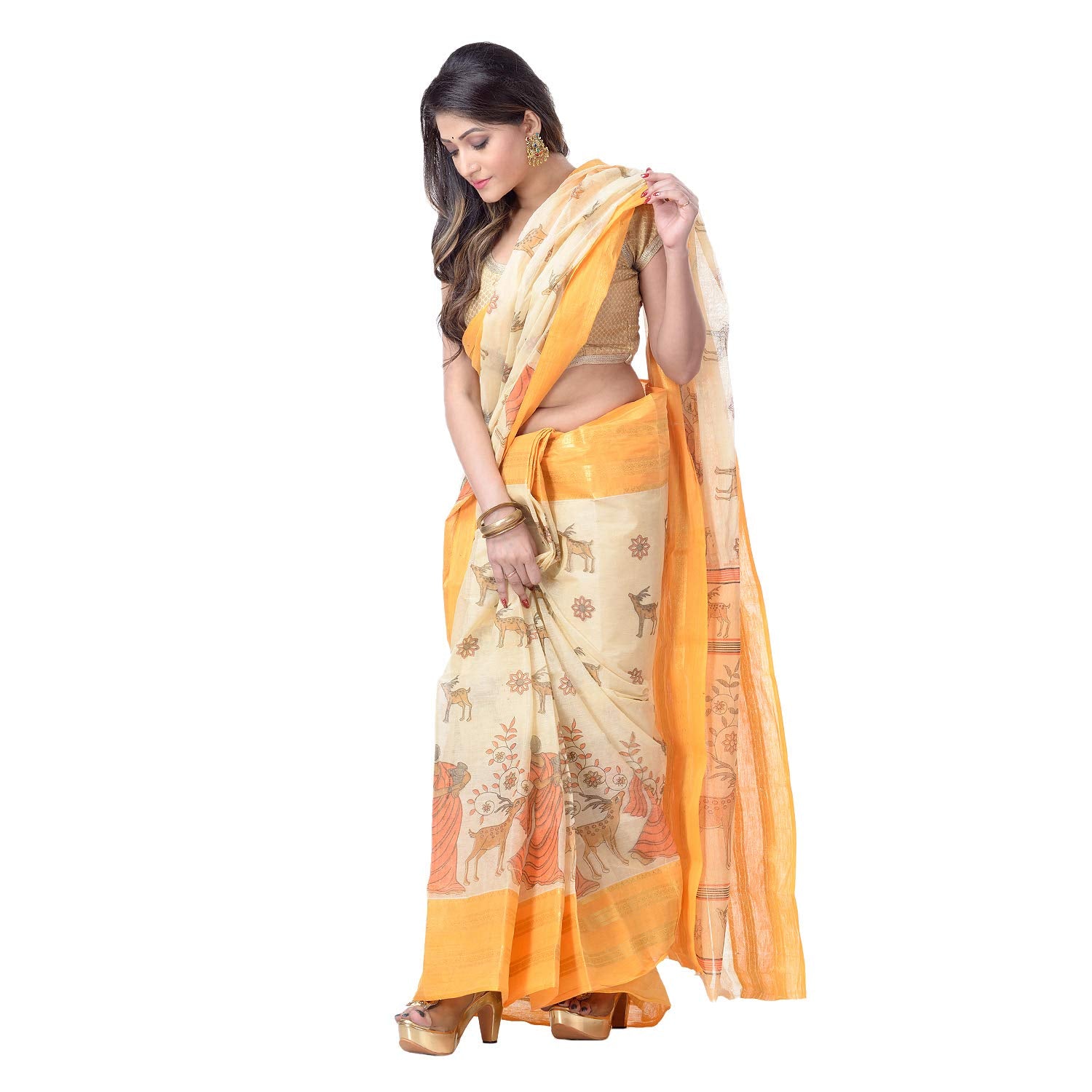 Desh Bidesh Women's Shakuntala Design Printed Tant Handloom Pure Cotton Saree Without Blouse Piece Saree Color: Cream Saree Fabric: Pure Cotton ...