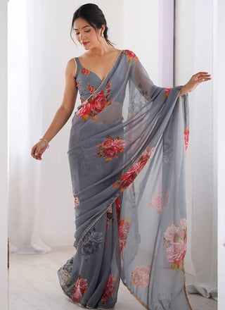 Vegaa Fashion Grey Georgette Silk Printed Moti Work Border Designer Saree