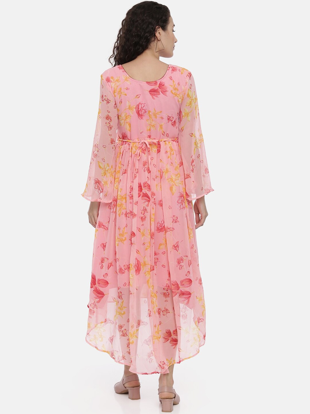Souchii Pink Floral Printed A-Line Dress For WomenPink printed woven A-line dress, has a round neck, long sleeves, an attached lining, and asymmetr...
