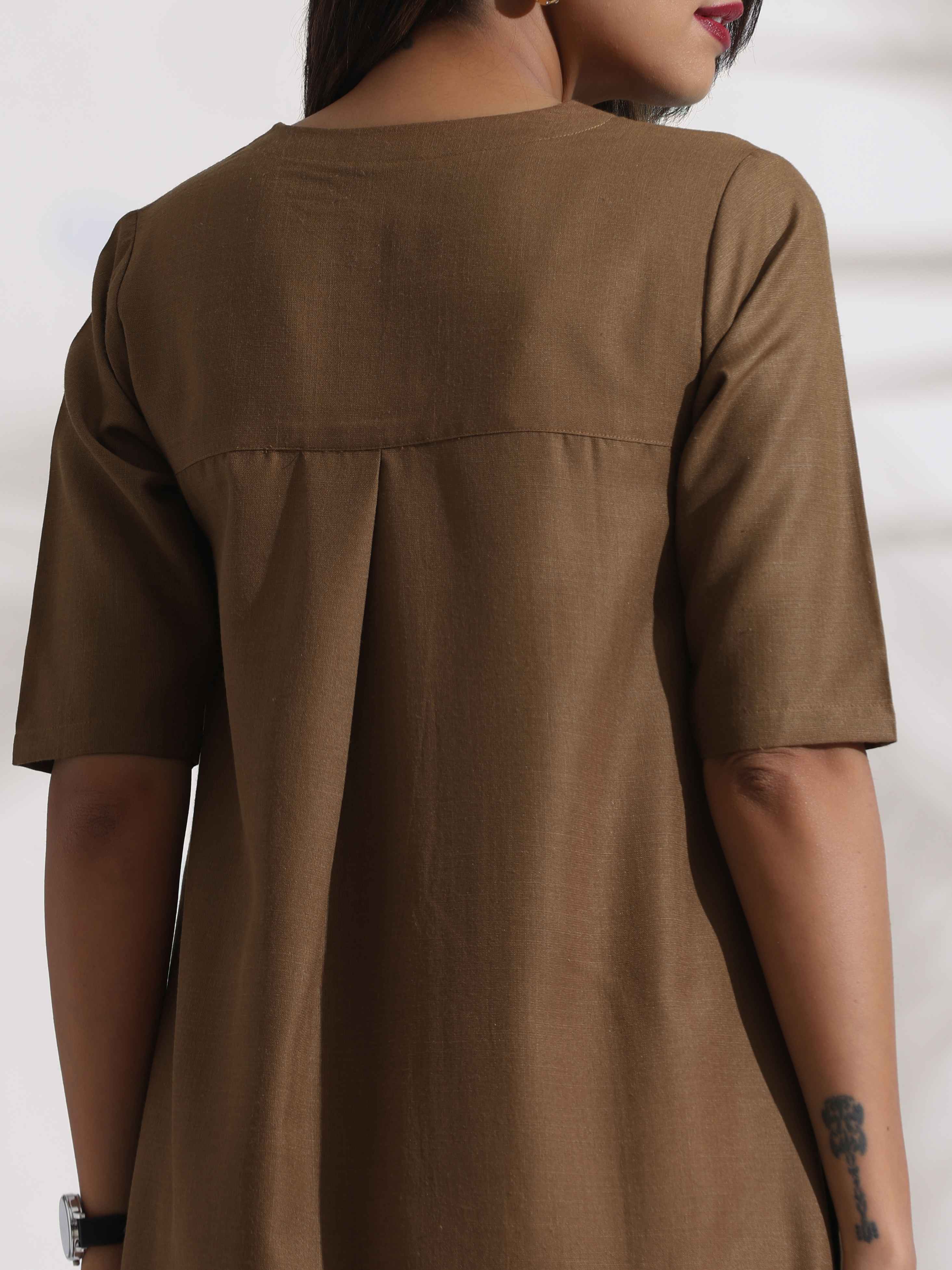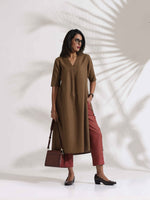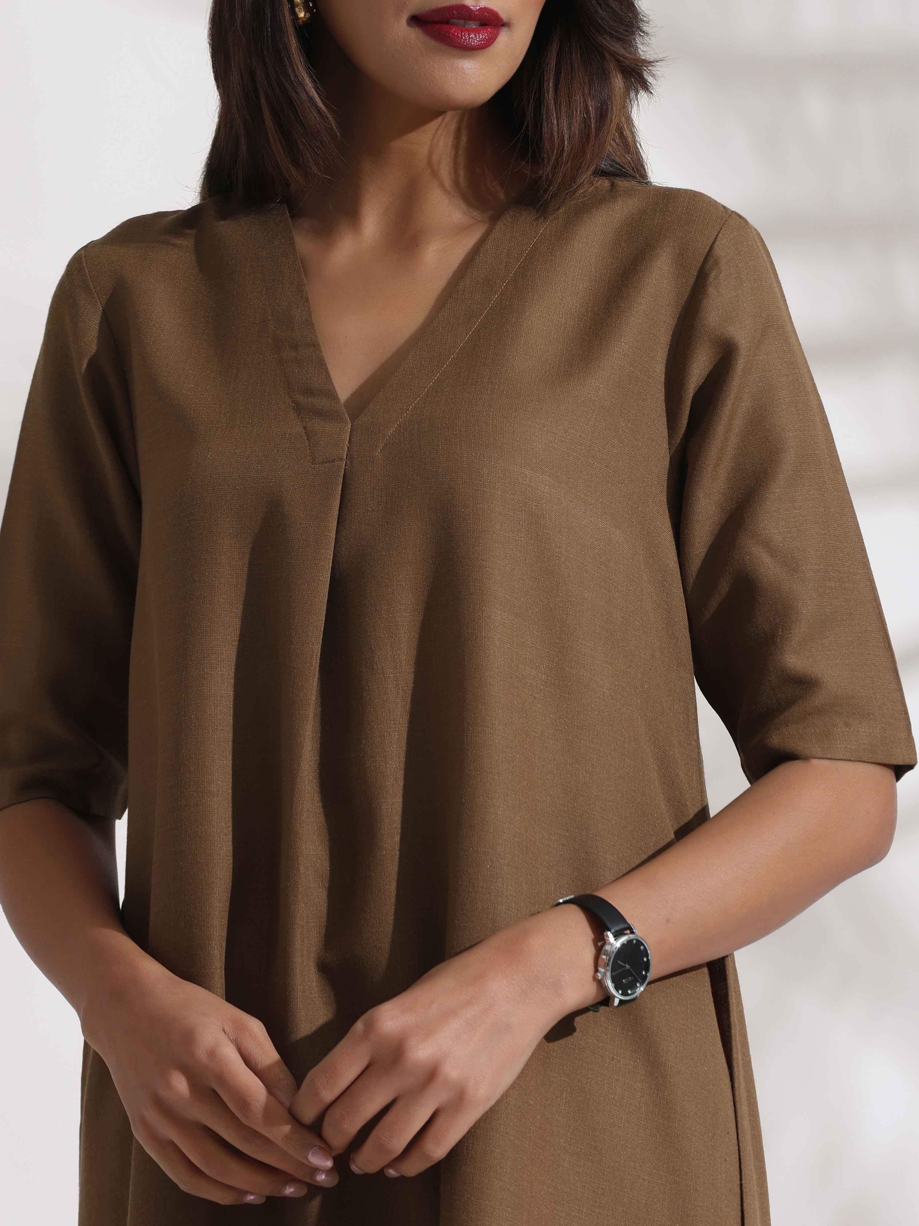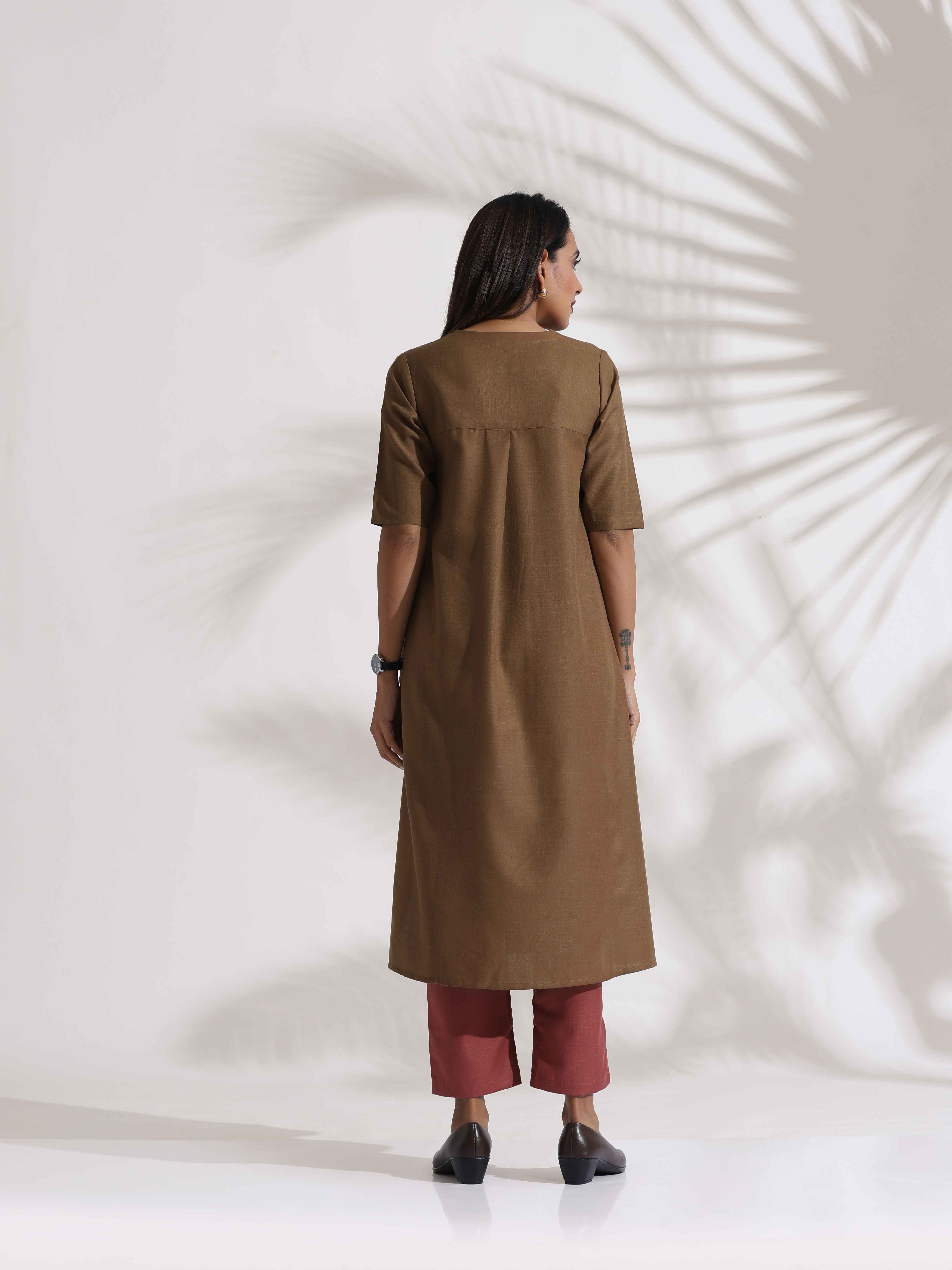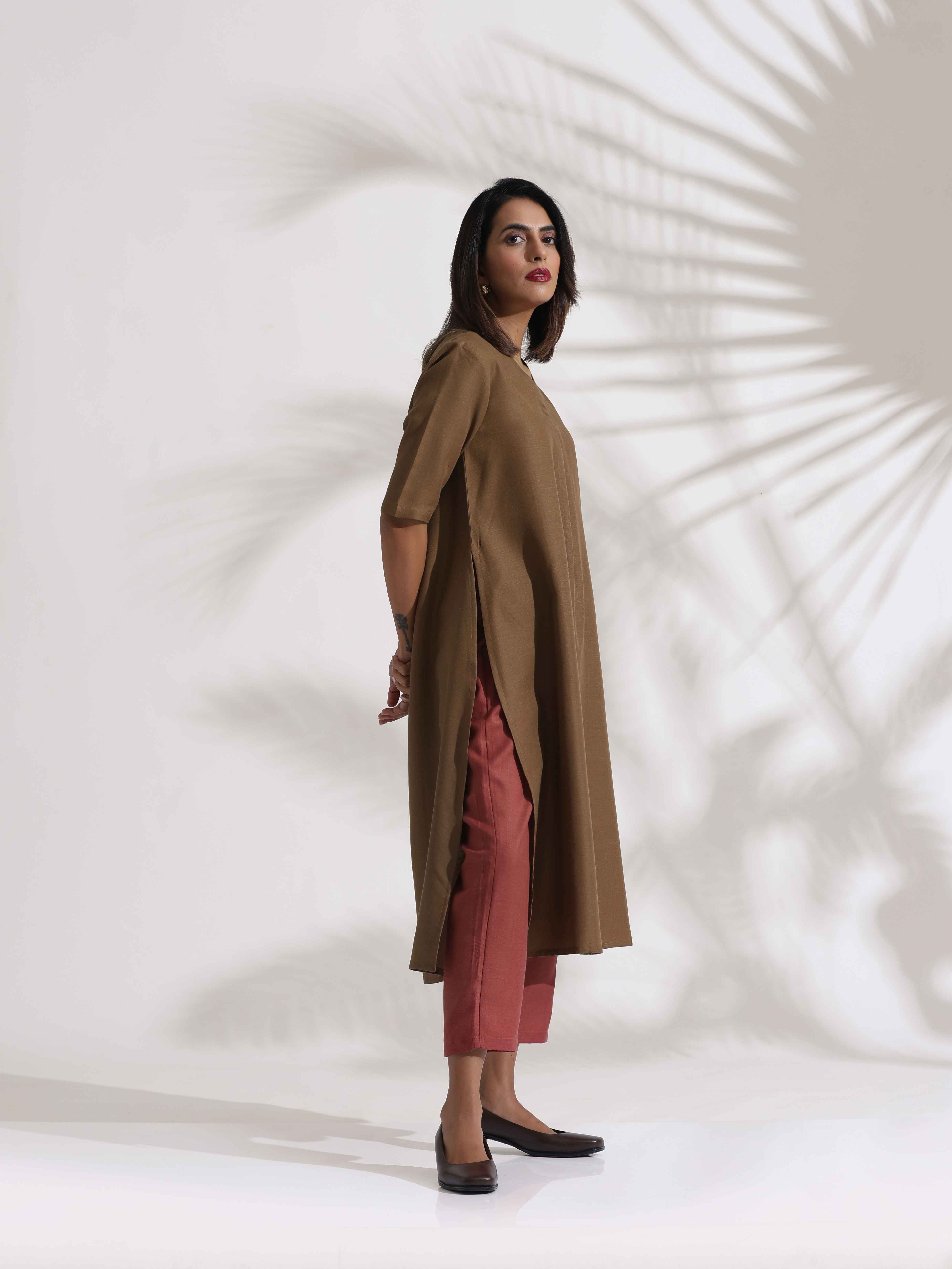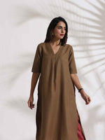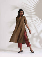trueBrowns Brown Slub Highslit Kurta Set - XS