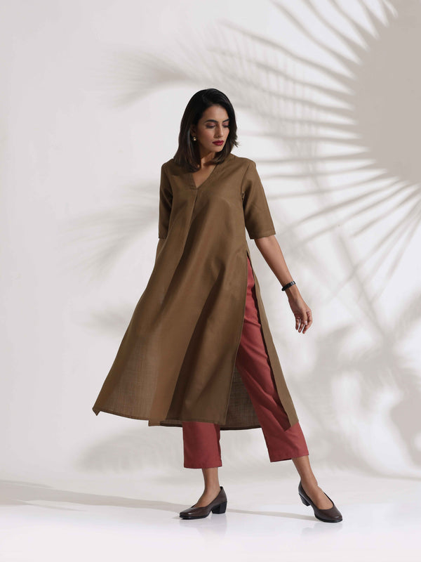 trueBrowns Brown Slub Highslit Kurta Set