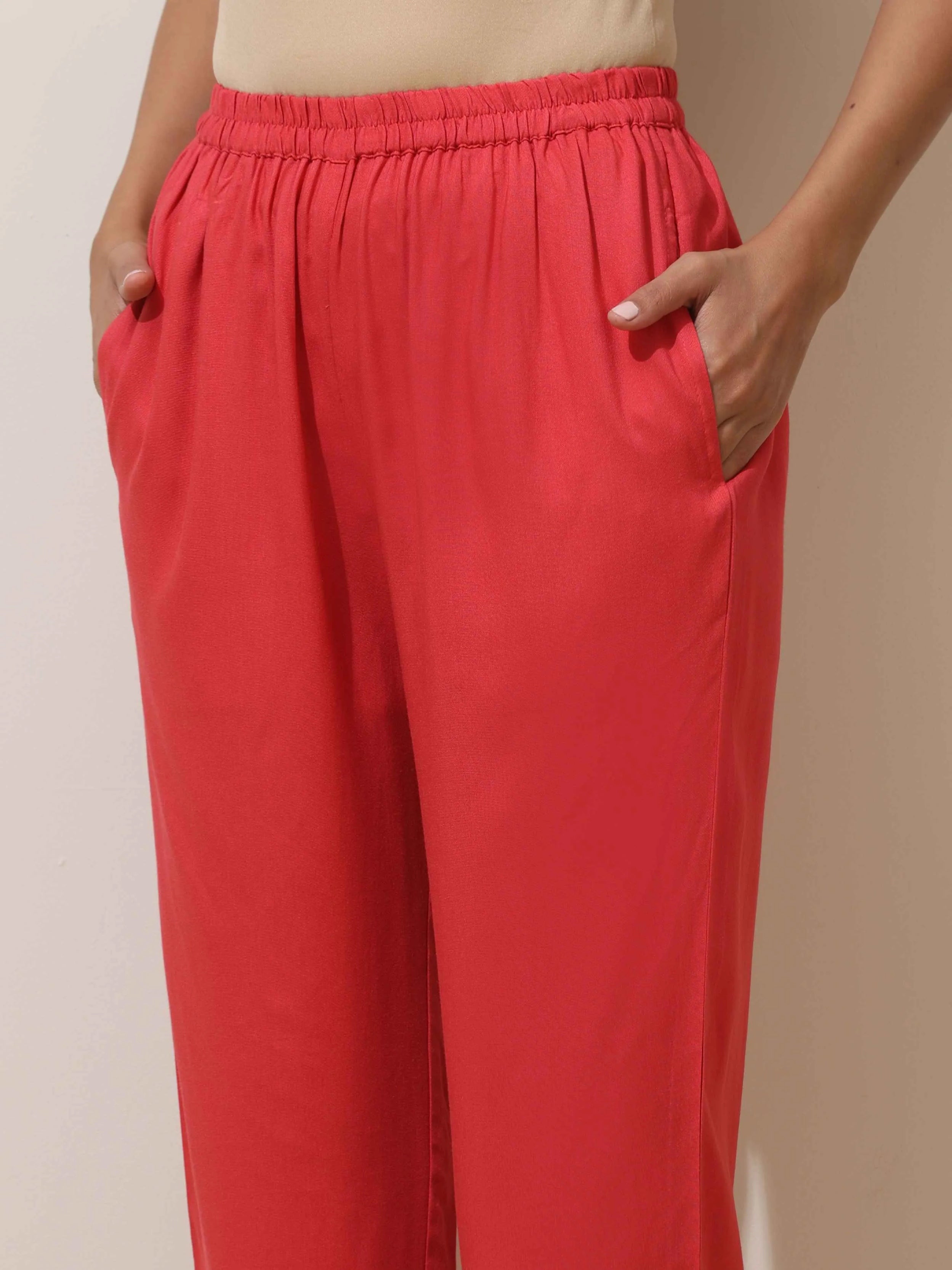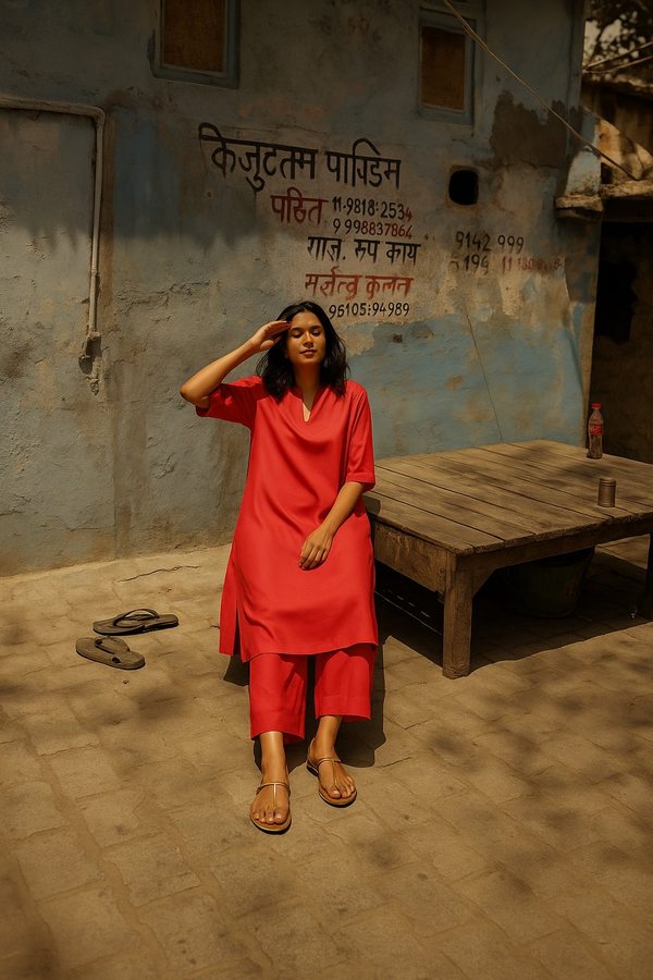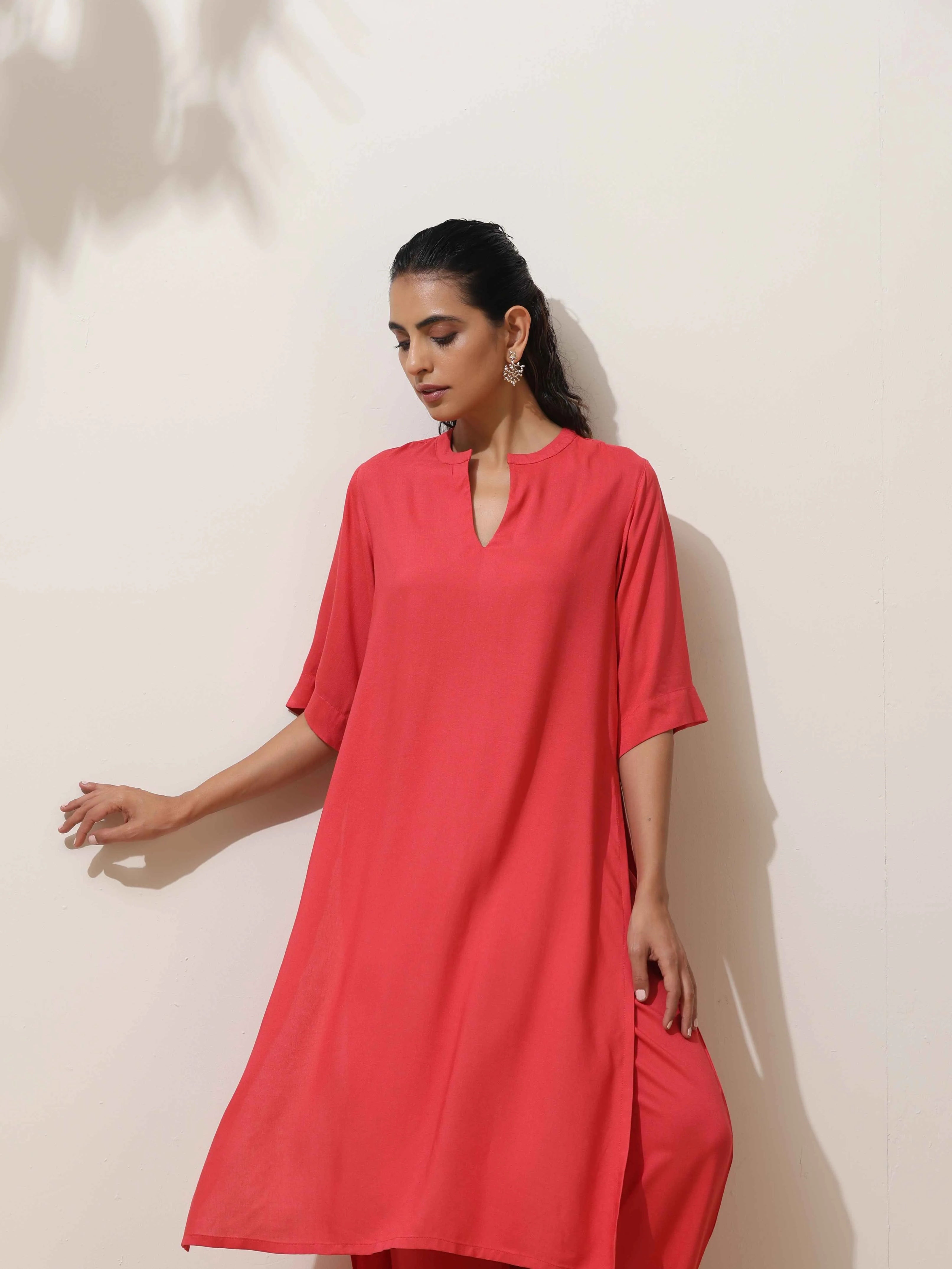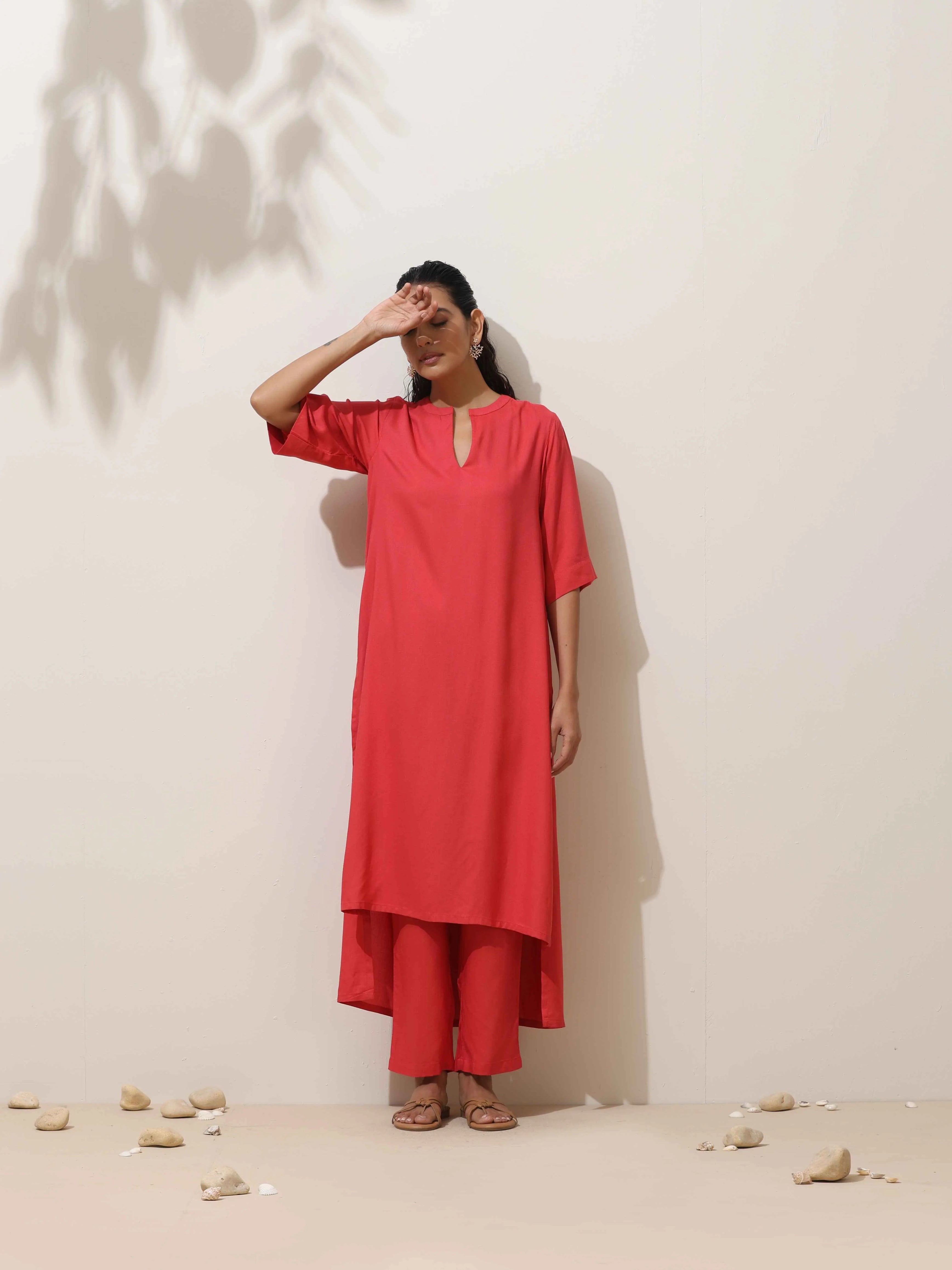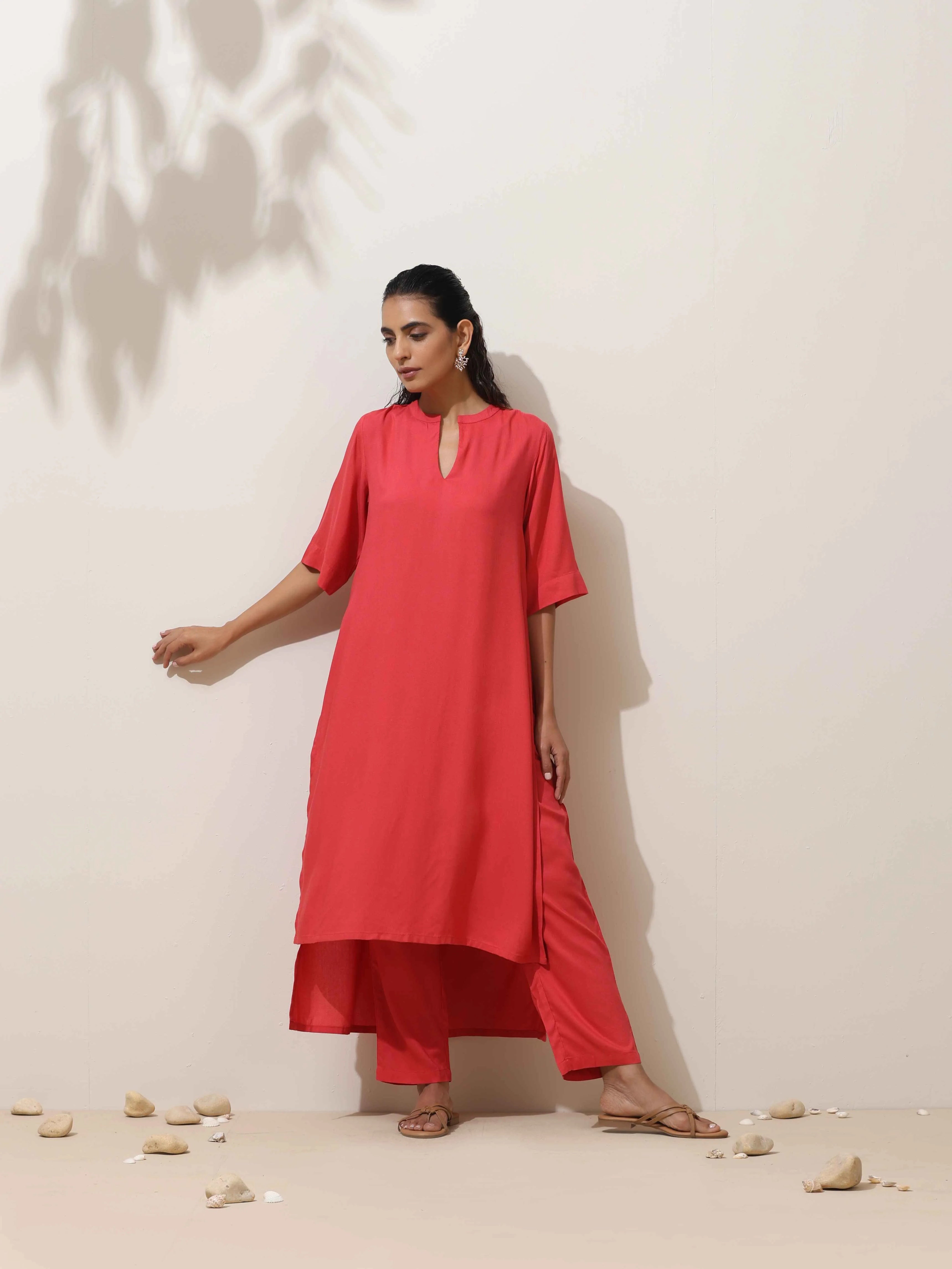 trueBrowns Coral Viscose Kurta Pant SetDescription Elevate your style with this stunning high-low coral kurta paired with coral pants, perfectly bl...