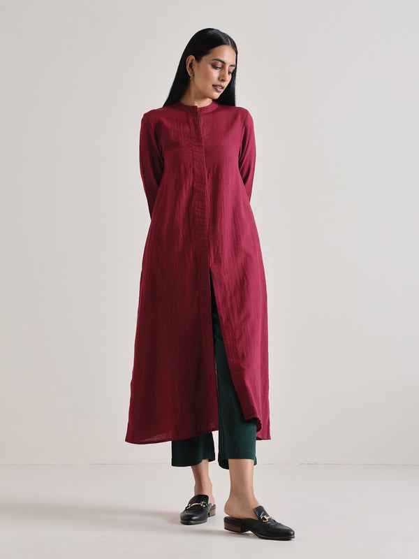 trueBrowns Maroon Placket Kurta Pant SetDescription Soothing Cotton comfortable flared slit Kurta with front placket and contrast inner facing deta...