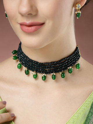 NVR Women's Green Artificial Beads Layered Necklace with Drop Earring