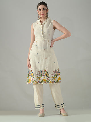 Myshka Women Off White Embroidered Lapel Collared Kurta With Trouser