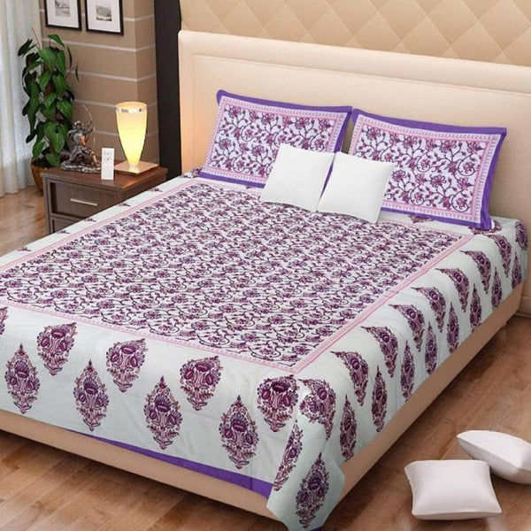 Vamika Printed Cotton White & Purple Bedsheet With Pillow Covers (LEOC_GMLA_PR)