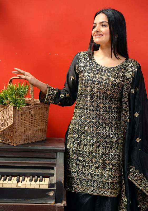 Prazu Fashion Black Chinon Silk Embroidered Sharara SuitTop:-Fabric : ChinonInner : MicroWork :Sequence Embroidery WorkTop Length : 36 InchSharara...