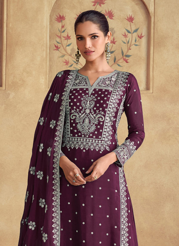 Vegaa Fashion Wine Georgette Embroidered Palazzo Suit