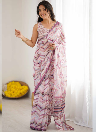 Vegaa Fashion Pink Georgette Printed Mirror Work Border Designer Saree