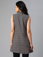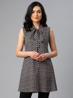 Ahalyaa Black & White Shirt Collar Printed TunicProduct Details:The Black and white printed tunic, has a shirt collar, sleeveless, tie-ups deta...