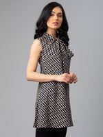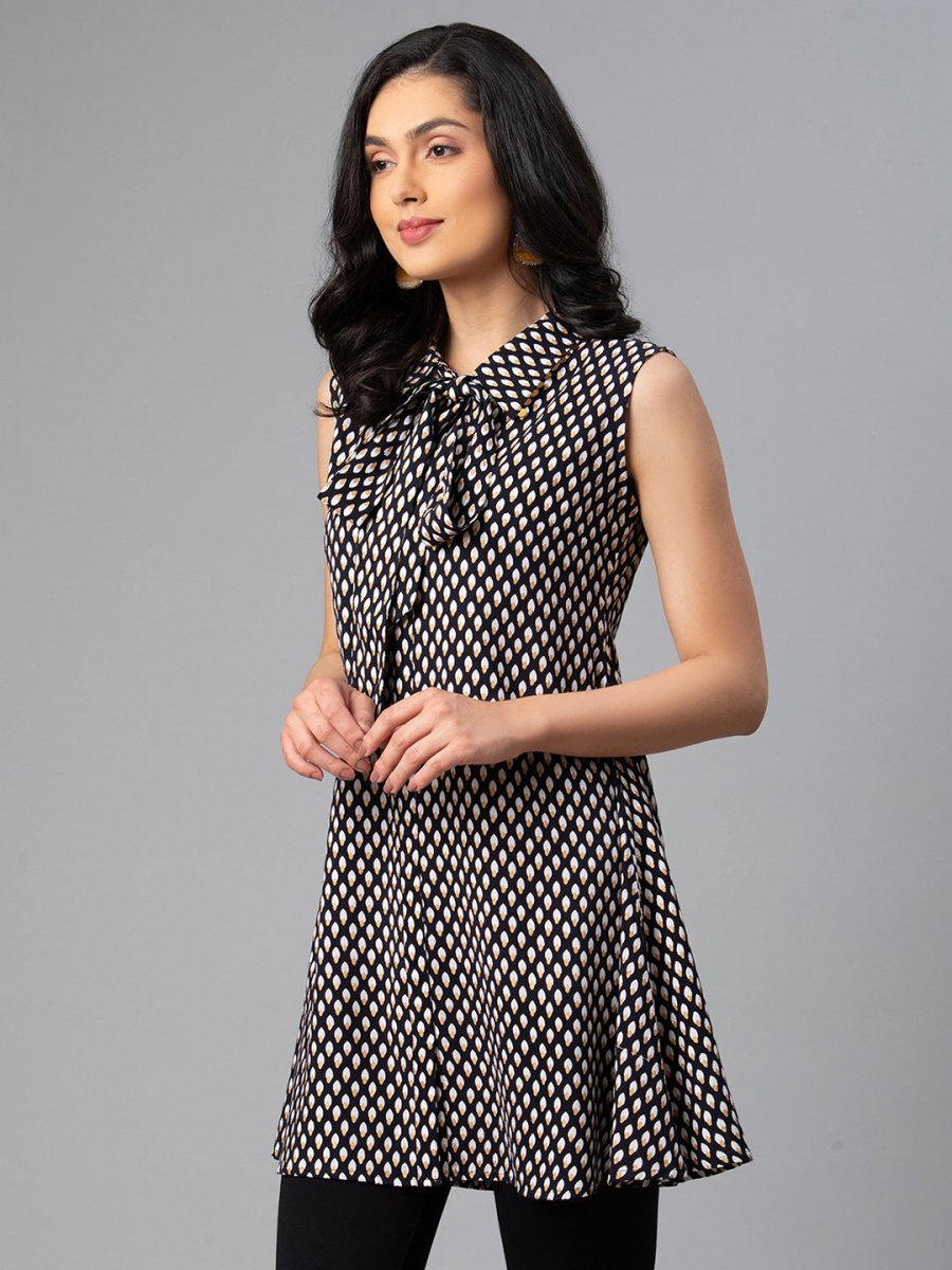 • The Black and white printed tunic, has a shirt collar, sleeveless, tie-ups detail