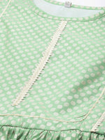 Taking the bright colors of summer and nature, Ahalyaa inspires the Women of style and substance to experiment with a range of colors from sophisticated black to subtle pastels and vibrant shades. So match the shade to your personality! Mix and match from a variety of colors and prints for a feminine look, or a modern twist.Sea Green and Golden printed Tunic, has a round neck, and three-quarter sleeves.