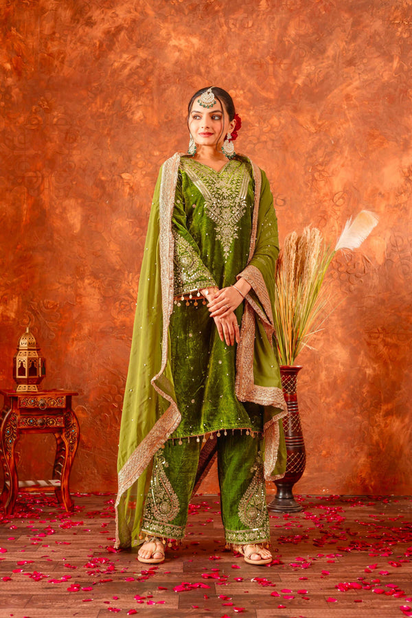 Joban Fashion Olive Green Velvet Embroidery Kurta SetProduct Details: Top Color : Olive Green Top Fabric : Velvet Bottom Fabric : Velvet Bottom Col...