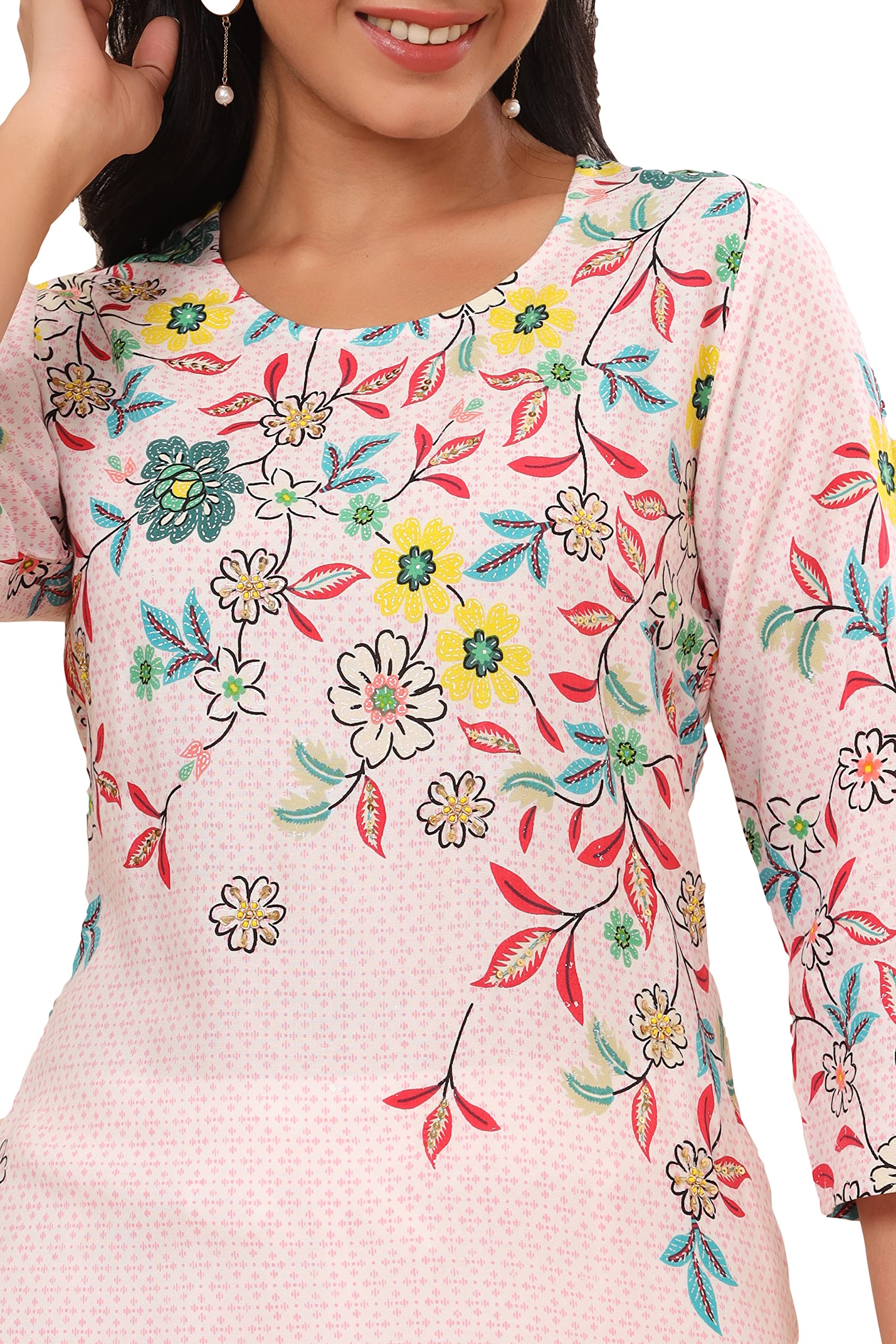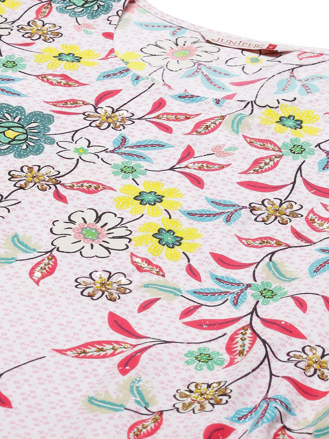 Juniper Women's Pink Floral Printed Rayon Kurta With Sequins & Beads Work Top Type: Kurta Top Pattern: Printed Print/Pattern Type/Trend: Fl...