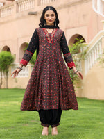 Black ethnic motif printed muslin Kurta Pant And Dupatta adorned with exquisite coin, thread, and mirror embellishments. The panelled A-line silhouette features a sophisticated V neckline, full regular sleeves, slip-on printed pants, and a delicate chiffon dupatta.