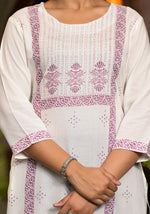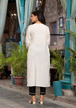 White Rayon Kurta adorned with intricate ethnic motif prints, Calf-length, straight silhouette, featuring a chic round neck and elegant three-quarter regular sleeves. Ideal for stylish casual wear.