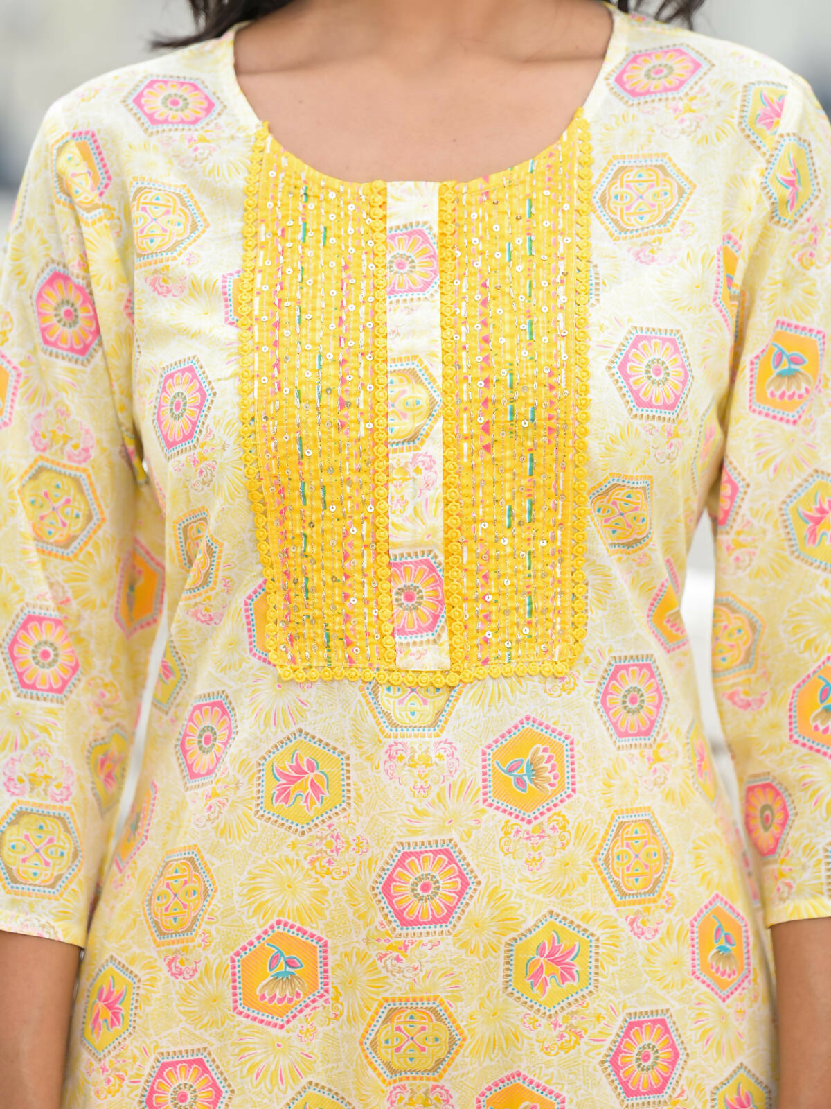 Juniper Women's Yellow Floral Printed Cotton Kurta Pant With Dupatta Set With Sequins & Thread Work Top Type: Kurta Dupatta(Yes, No): Yes To...