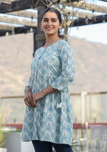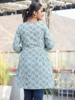 Kaajh Off White Green Printed Shirt Style Cotton TunicA perfect pick for summer-spring, this maroon shirt style printed cotton tunic is a fusion ma...