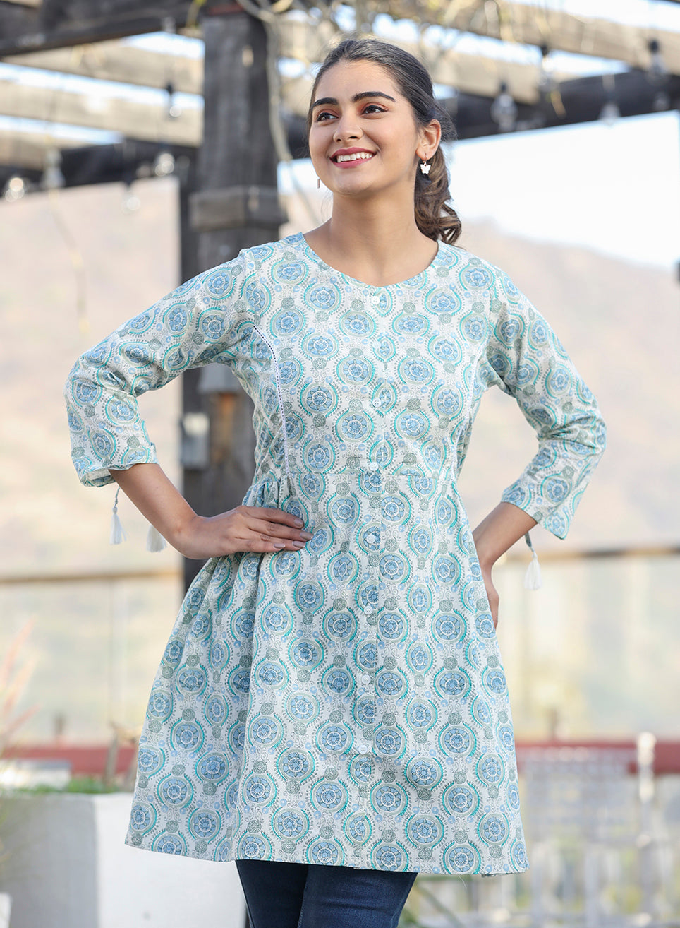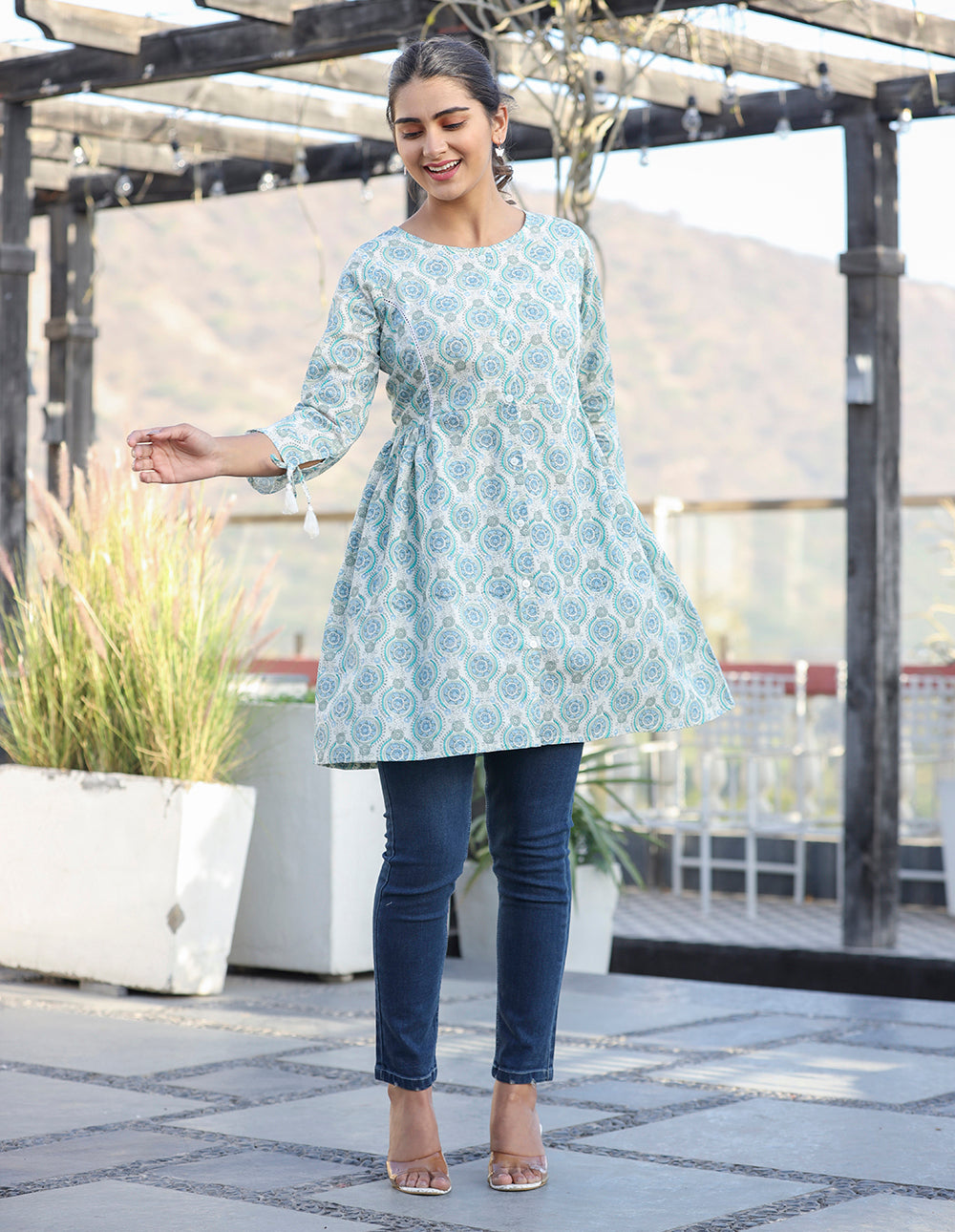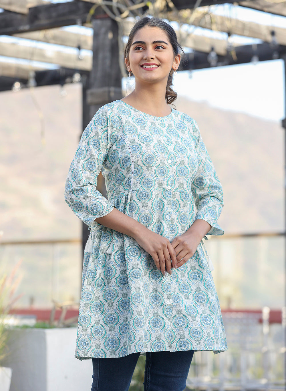 A perfect pick for summer-spring, this maroon shirt style printed cotton tunic is a fusion match for your evening wardrobe as well as daily 9 to 5 work wear. Easily match this cotton tunic with your favorite denim jeans, legging, or trousers to complete your casual look. You can explore and find your favorite collection of Tunics and Tops from KAAJH. Highlights: 3/4 Sleeves, Round Neck, Regular Length, Relaxed Fit, 100% Cotton