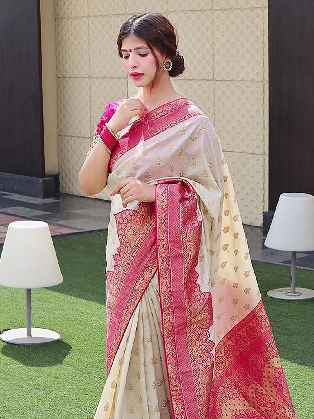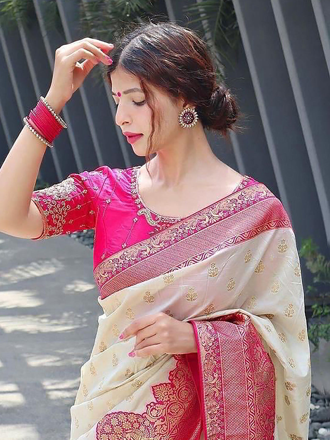 Kalini Ethnic Motifs Woven Design Zari Banarasi Saree Product Details Design Details White & Pink Zari Banarasi Saree Ethnic Motifs woven ...