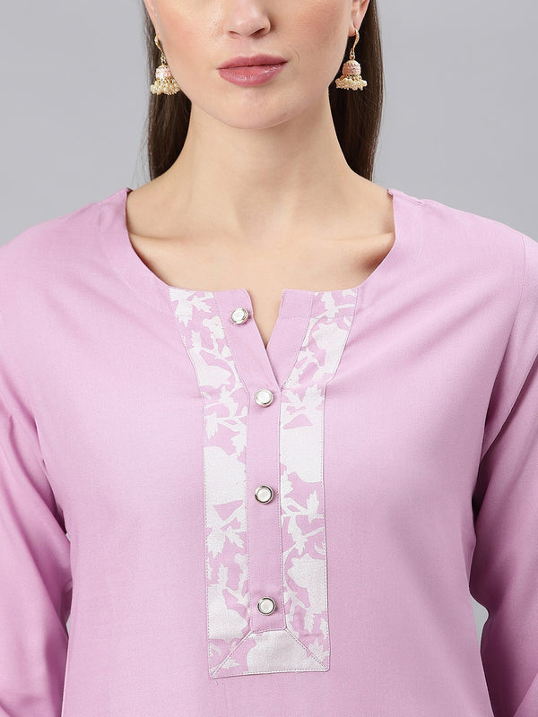 Lavender straight calf length kurta, has a round neck, three-quarter sleeves, straight hem, side slits