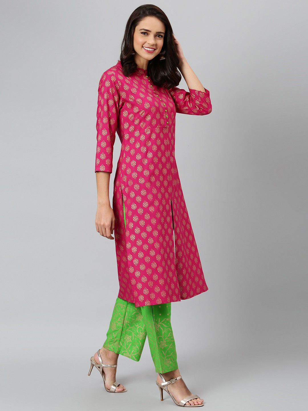 Pink and green straight calf length kurta, has a mandarin collar, three-quarter sleeves, straight hem, multiple slits