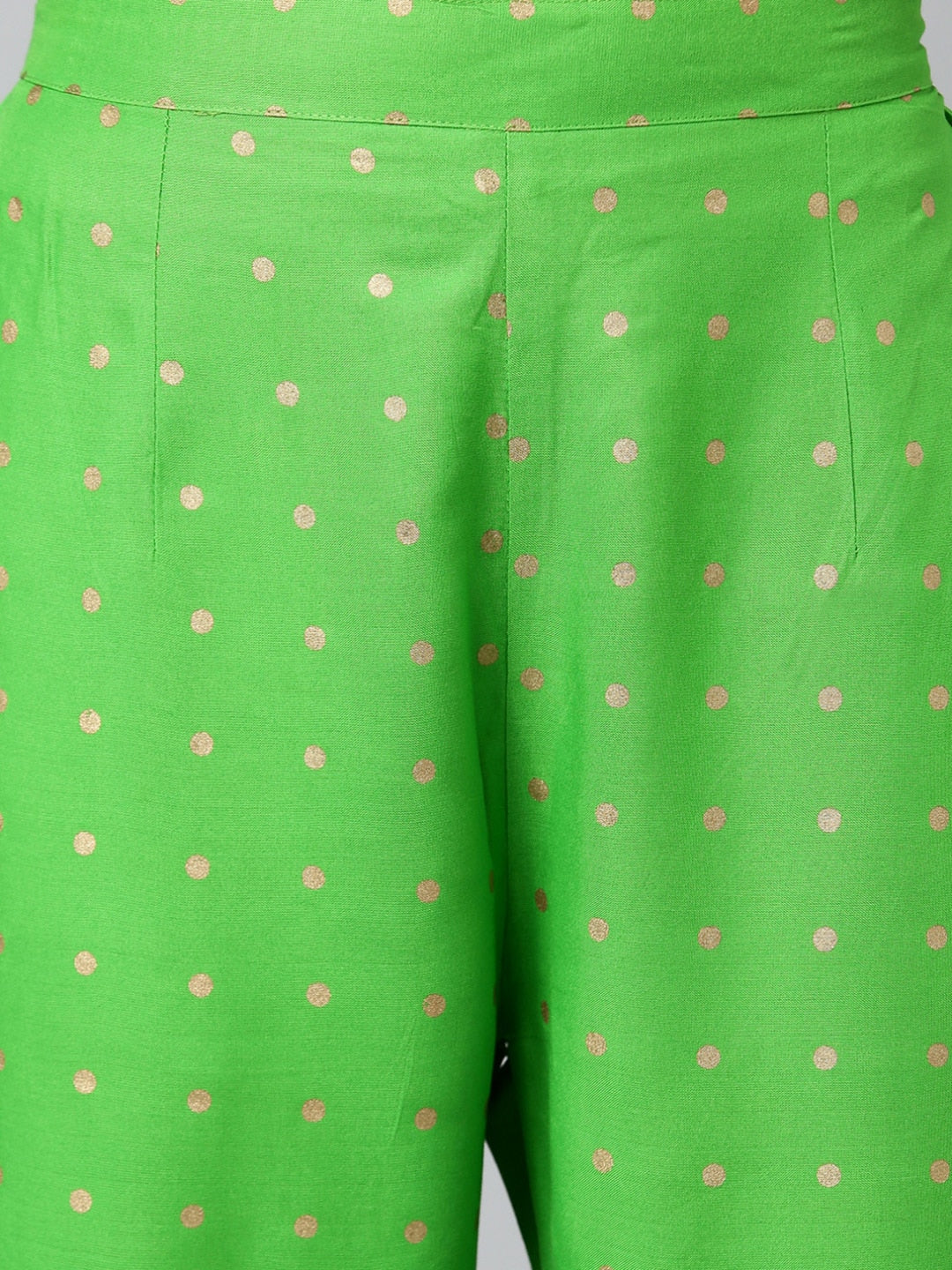Green printed palazzos, has partially elasticated waistband, slip-on closure