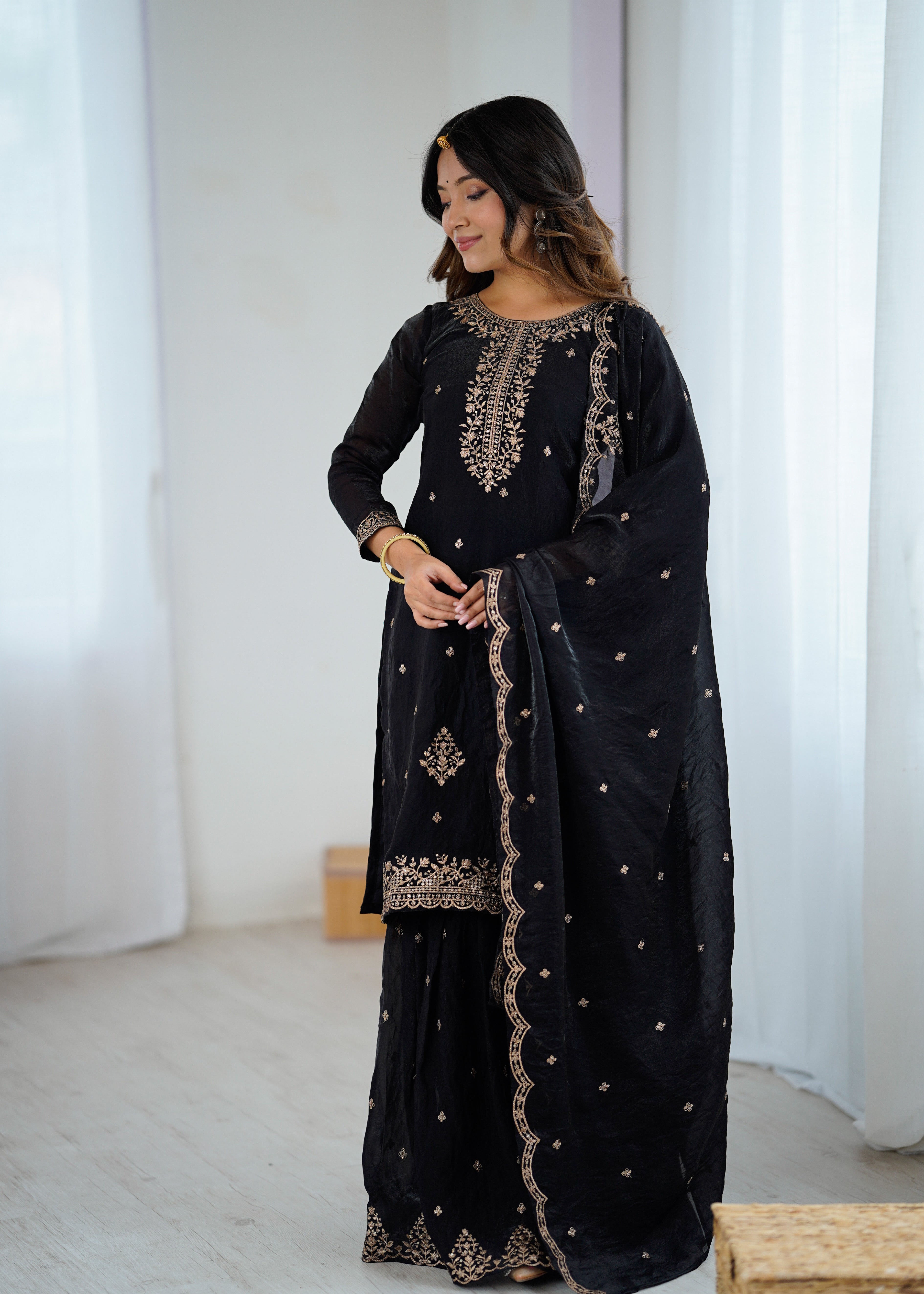 Lorenvalley Black Soft Crunchy Silk with Embroidery Sequence and Jari Work Kurta Palazzo with Dupatta Kurta Fabric: - Pure Soft Crunchy Silk Fabric...