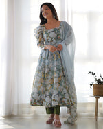 Lorenvalley Grey Soft Organza Silk With Floral Print Fully Flared Anarkali Pant With Dupatta Set
