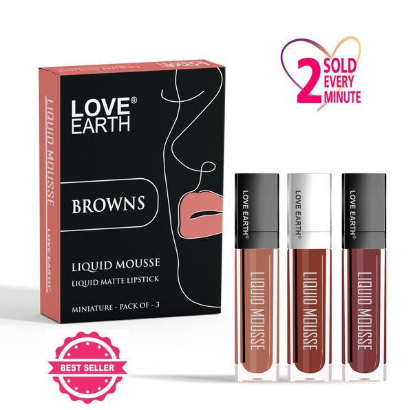 Love Earth Liquid matte finish lipstick glides on effortlessly for a velvety, air-light feel.Intense Pigmentation: Long-lasting shades that stay vibrant throughout the day.Vitamin E & Almond Oil: Enriched with nourishing ingredients to keep lips moisturized and soft.Non-Sticky & Lightweight: Designed for all-day wear without discomfort.Whether it`s a casual day out or a glamorous evening, this pack of 3 versatile shades will complement every look.