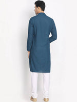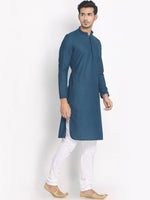 Blue straight knee length kurta, has a mandarin collar, long sleeves, straight hem, side slits