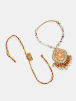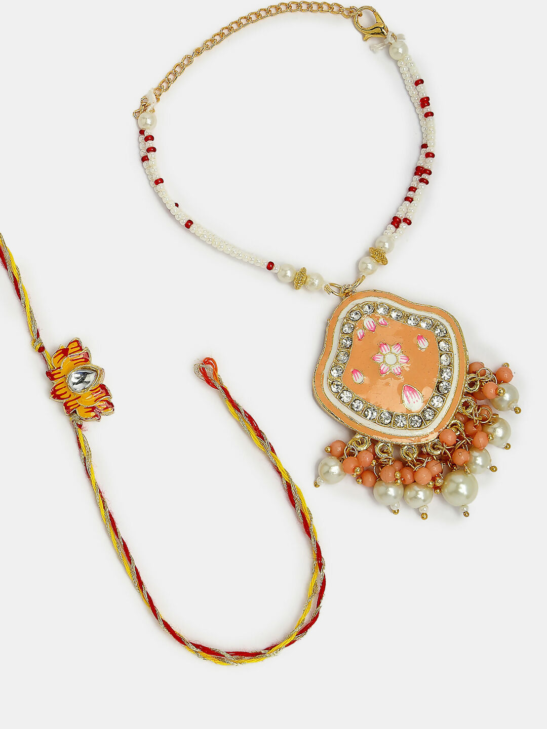 NVR Women & Men Set of 2 Peach Lotus Shape Kundan Stone-Studded & Beaded Bhaiya Bhabhi Rakhi With Roli Chawal & Chocolate Style Note: C...