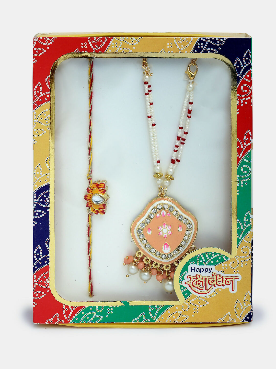 NVR Women & Men Set of 2 Peach Lotus Shape Kundan Stone-Studded & Beaded Bhaiya Bhabhi Rakhi With Roli Chawal & Chocolate