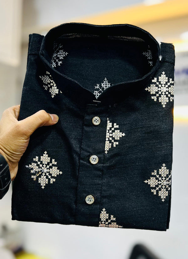 Prazu Fashion Black Silk Copper Sequence Work KurtaAbout the Product: GENDER : male Colour : Black Work/Pattern : Sequence Fabric : Silk Neck Line ...
